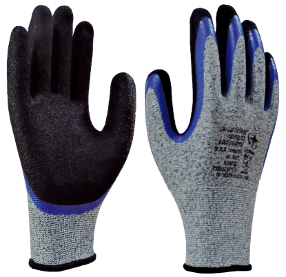 Luva de segurança confeccionada em fios de HPPE (polietileno de alto peso molecular), nylon, lycra e fibra de vidro; revestimento na face palmar, face palmar dos dedos e ponta dos dedos em PU (poliuretano), punho com inserções de fibras elásticas e acabamento em fibras sintéticas.
