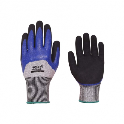 Luva de segurança confeccionada em látex natural, revestimento interno em flocos de algodão, relevo antiderrapante da face palmar e face palmar dos dedos.