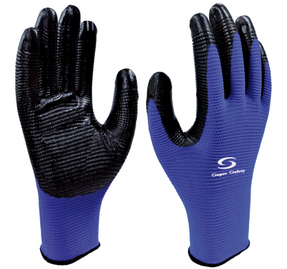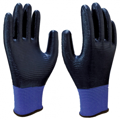 Luva de segurança confeccionada em borracha nitrílica, sem pulverização de amido de milho, ambidestra, superfície externa lisa.